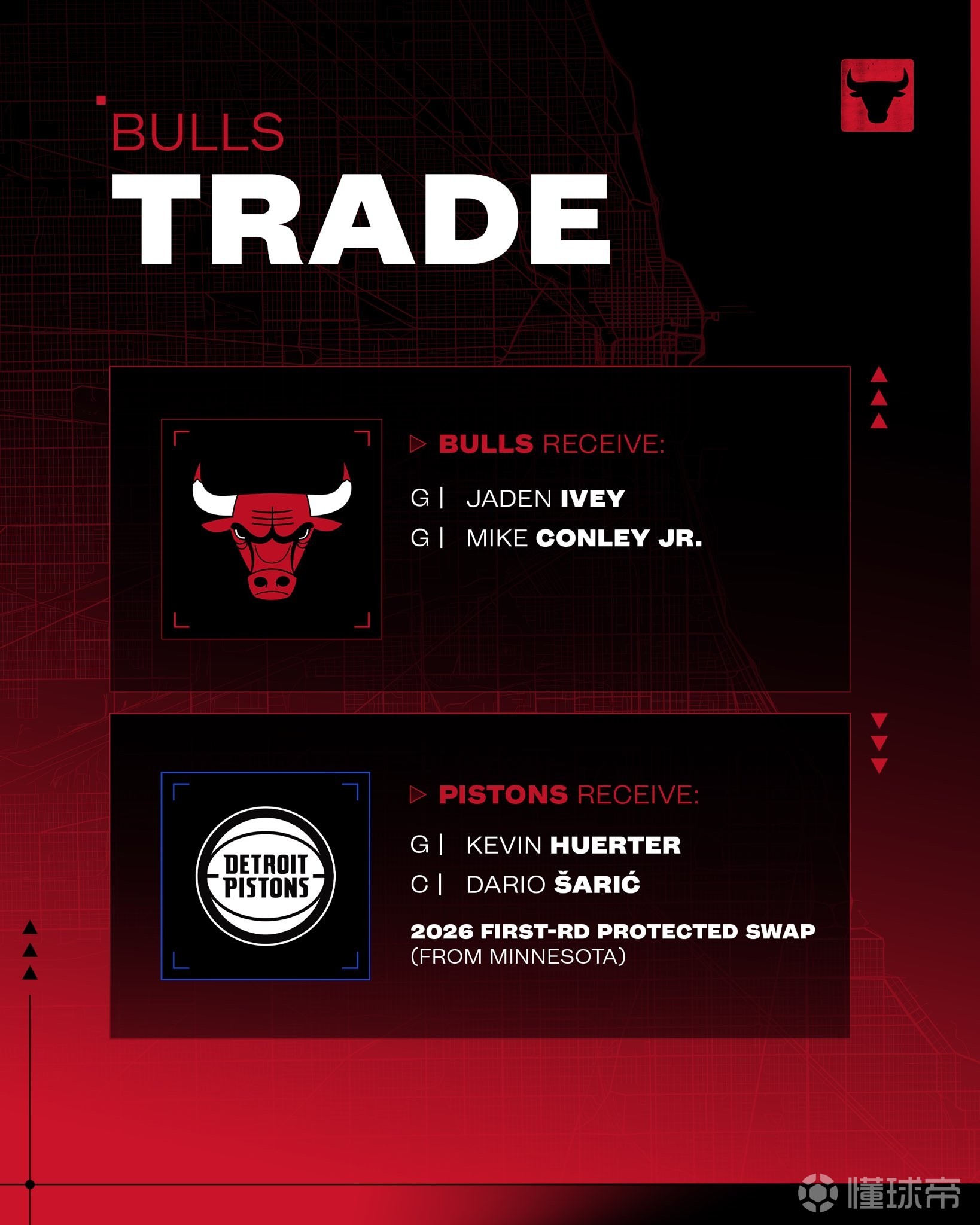 芝加哥公牛官方写道:“官方公告: 我们已通过一笔涉及活塞队与森林狼队的三方交易,成功获得杰登-艾维与迈克-康利。”