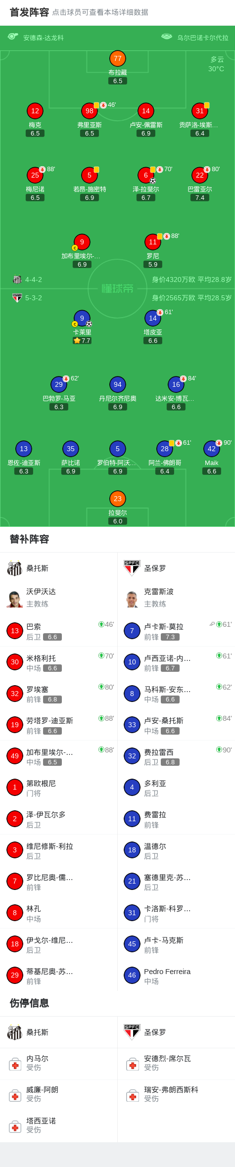 北京时间2月5日巴西足球甲级联赛 联赛 第2轮,桑托斯主场对阵圣保罗。桑托斯泽-拉斐尔破门。圣保罗卡莱里破门。最终比分桑托斯 1-1 圣保罗。