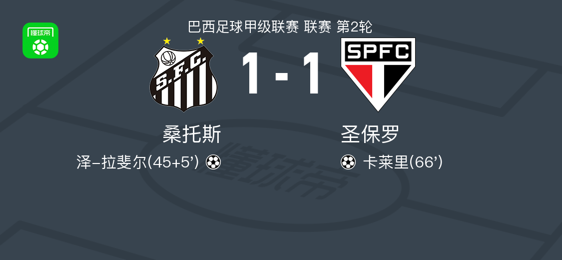 北京时间2月5日巴西足球甲级联赛 联赛 第2轮,桑托斯主场对阵圣保罗。桑托斯泽-拉斐尔破门。圣保罗卡莱里破门。最终比分桑托斯 1-1 圣保罗。