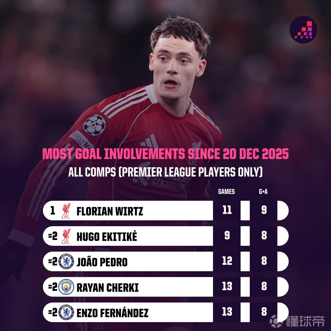 2025年12月20日,维尔茨在对阵热刺的比赛中斩获首次英超助攻,此后这名德国攻击中场延续出色的发挥,在近11场比赛里贡献6球3助攻,直接参与9球,这是英超球员同期最高数据。